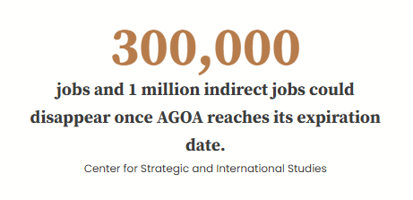 The trade deal has largely been mutually beneficial for American suppliers and African workers alike, providing duty-free access to valuable foreign goods and apparel while enhancing economic opportunities for 32 eligible sub-Saharan countries, many of which are considered developing nations. A report from the Center for Strategic and International Studies estimated that close to 300,000 jobs and up to 1 million indirect jobs would disappear once the deal hit its expiration date.