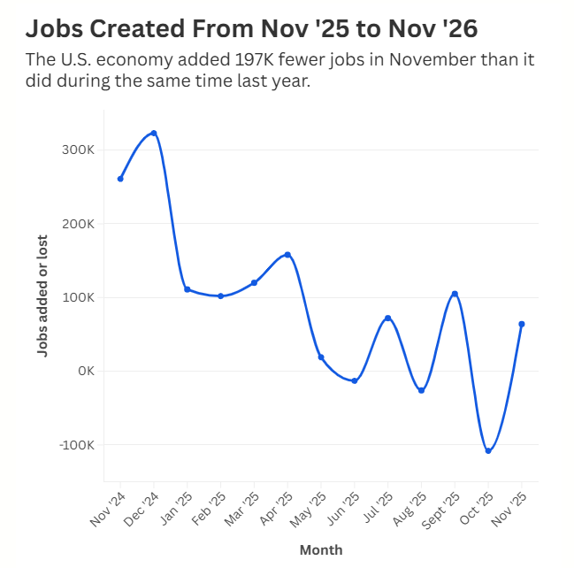 • The U.S. lost 105,000 jobs in October and gained 64,000 in November, while unemployment rose to 4.6%, its highest level in four years, signaling ongoing labor-market challenges amid economic uncertainty and AI-driven restructuring.