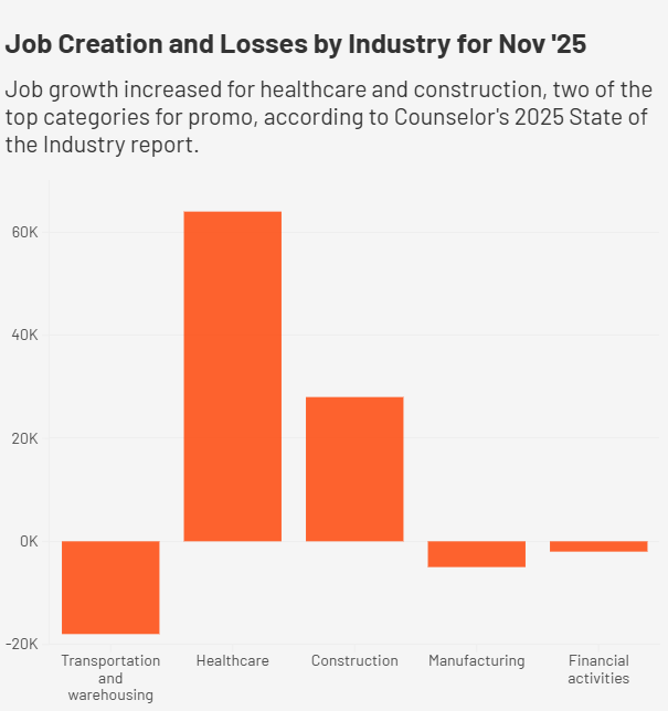• Healthcare (+46,300 jobs) and construction (+28,000 jobs) remain bright spots, creating strong potential for promo campaigns focused on employee recognition, onboarding and workwear.