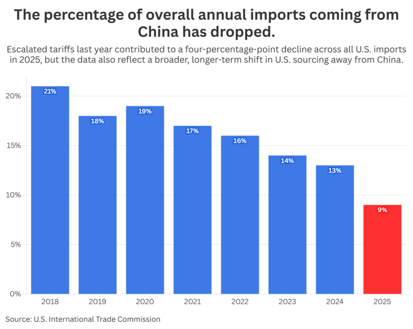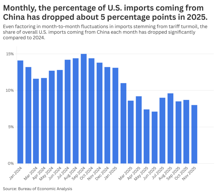 Tellingly, the decline in U.S. imports from China isn’t merely reflective of reduced overall imports. In 2024, the average monthly share of imports from China was about 13%. Excluding the first few months of the year before the initial tariff announcement, in 2025, that figure fell to about 8.5%. Those monthly numbers are similar to the annual percentage of imports from China in 2024 and 2025 – and continue a downward trend since the pandemic.