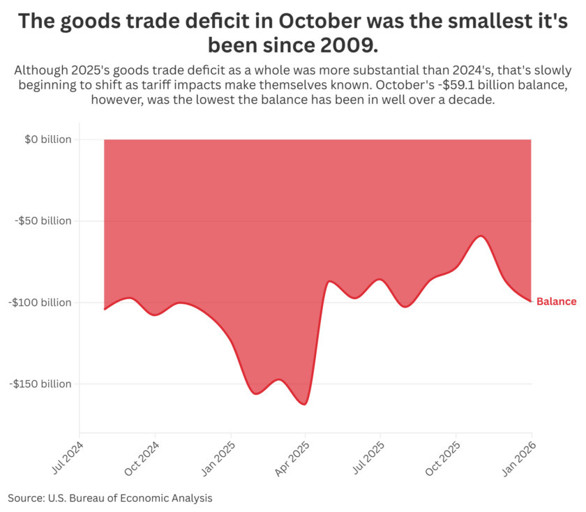 Trade experts have warned against drawing too many conclusions from the data. For one, goods imported spiked heavily in Q1 as U.S. businesses and retailers braced for potential tariffs to go into effect following Trump’s inauguration. Imports dropped back down in April, spiked again slightly in July ahead of another round of reciprocal tariffs, then fell after those tariffs went into effect, then rose again through the end of the year. November and December’s figures, in particular, were overall comparable to import levels throughout 2024.