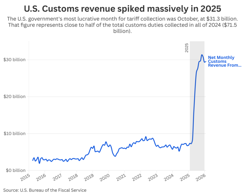 In 2025, that figure had been surpassed by June. Through the full year, the U.S. government collected more than $265 billion in tariffs and customs duties – 3.7 times the 2024 total.