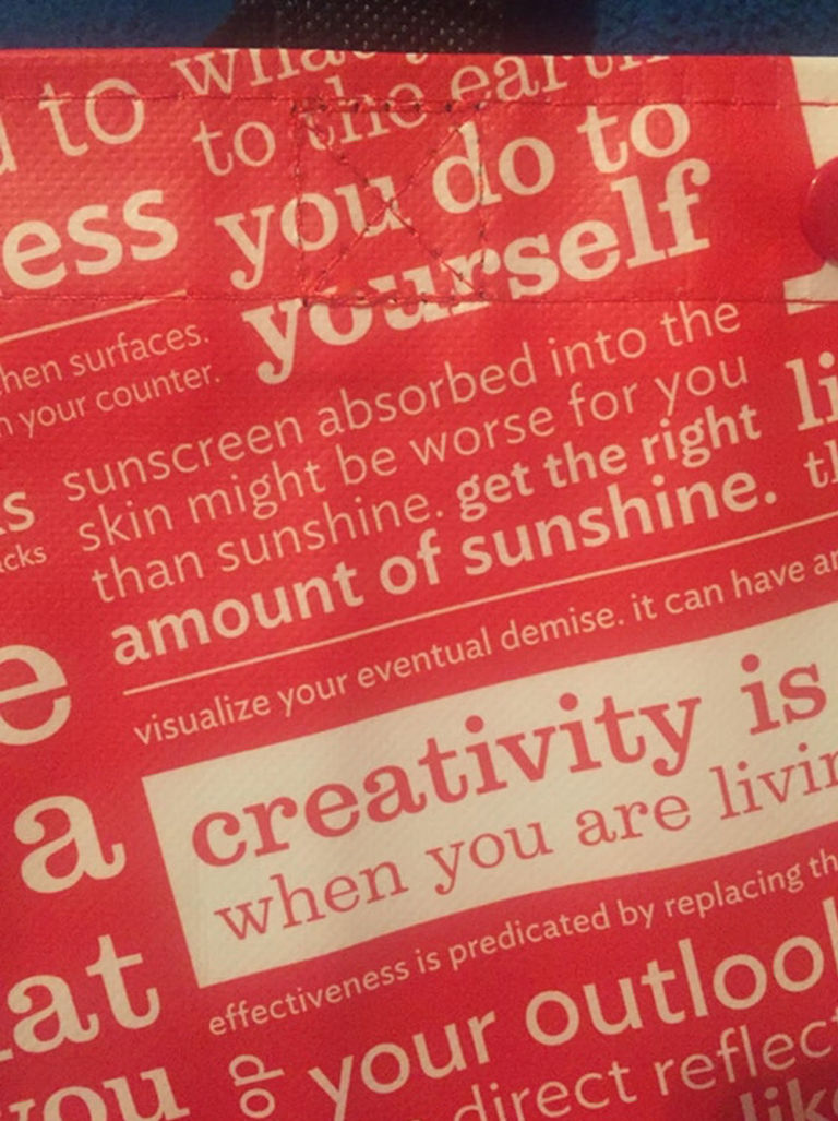When we say that this bag from Lululemon makes a statement, we don’t mean something like “This bag shows that I enjoy athletic activity and stylish apparel.” No. This bag says “That sunblock that you’re putting on your body is seeping in and quietly destroying you, and you should plan for your own eventual downfall…