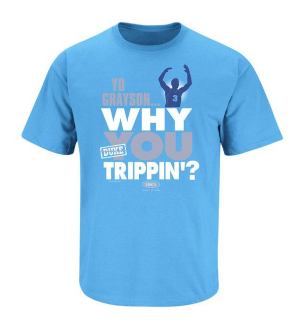 Duke University sent a cease and desist letter to Tampa, Florida-based Smack Apparel after the company started making T-shirts mocking Duke junior guard Grayson Allen. The shirts feature a silhouette with the number 3 in the middle, and the phrase “Yo Grayson … Why You Trippin’?” This is a reference to Allen’s multiple tripping incidents…
