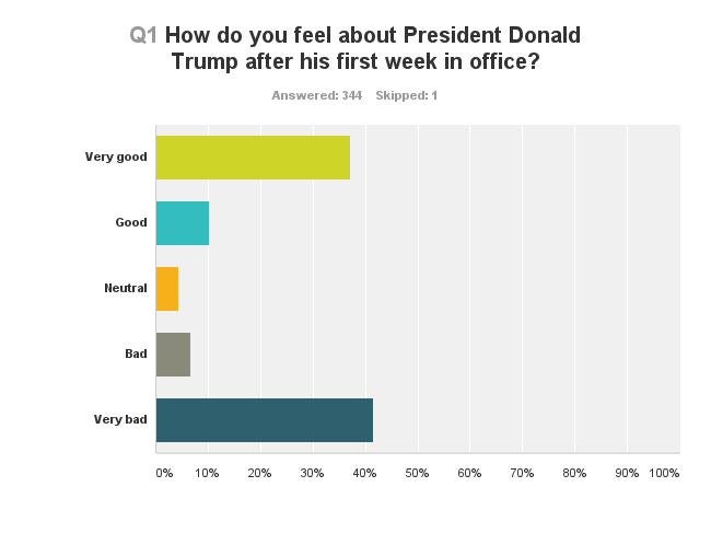 Over the past week, we ran a poll asking readers their opinions of President Trump after his first week in office. After more than 300 readers responded, we found the results to be fairly polarized. 42 percent answered “very bad,” 37 percent said “very good,” 10 percent said “good,” 4 percent were neutral and 7…
